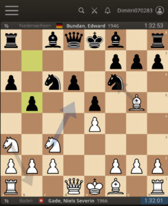 Direkt in der ersten Runde musste Niedersachsen mit einem starken Team aus Baden zu tun haben. Edward spielte mit schwarzen Figuren gegen Niels Severin Gade (1966 ELO). Auf e4 hat sich Edward für die Variante Sveshnikov entschieden. Auf seine Lieblingsverteidigung. Der Gegner wusste es und hat sich anscheinend auf diese Verteidigung gut vorbereitet zu sein.
