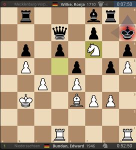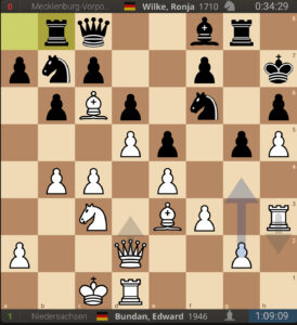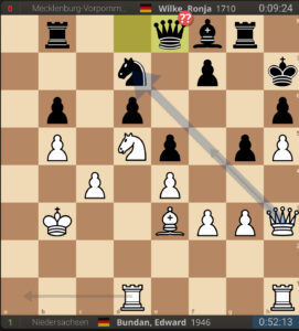 In der Nachmittagsrunde spielte unser Team gegen die Auswahl von Mecklenburg-Vorpommern. Jetzt spielte Edward mit weißen Figuren gegen Ronja Wilke. Und Edward hat diese Partie von Anfang an dominiert. Ich zitiere den Text von Fabian: „Edward zeigte eine wahre Machtdemonstration. Er kontrollierte, Königsflügel, Damenflügel und das Zentrum in nur 20 Zügen! Ganz toll und irgendwann ging taktisch eine Figur über die Wupper und der Rest war Verwertung zum sicheren Sieg.“