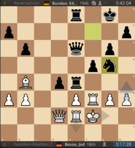In der dritten Runde spielte unser Team gegen NRW 2. Edward spielte gegen den jüngeren Bruder von FM Hussein Besou. Mit gerade erst 9 Jahren hat schon Jad 1865 ELO. Edward musste wieder mit schwarzen Figuren spielen und hat sich auf den Zug d4 und anschließend c4 für Halbslawische Verteidigung entschieden. Und das mit Erfolg. Bereits aus der Eröffnung kam Edward besser als seinen Gegner raus. Im Mittelspiel hat Edward schon einen guten Ausgangspunkt für sich rausgeholt und gewann anschließend die Partie.