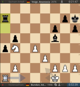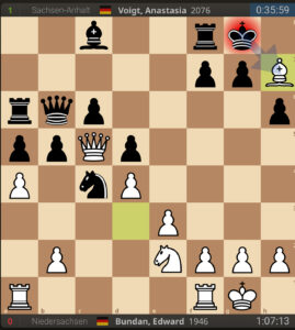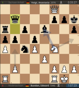 In der 4. Runde spielte Edward mit weiß das Damengambit gegen Anastasia Vogt (2076 ELO). Kam auch aus der Eröffnung ordentlich raus und stand sogar nach dem Quali-Gewinn im Mittelspiel schon auf der Siegesstraße (Vorteil von +2,5).