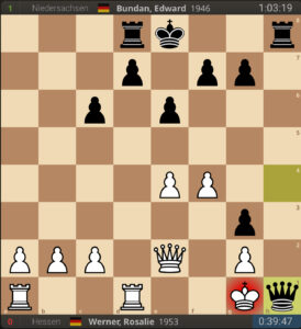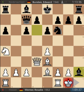 In der 5. Runde spielte Edward wieder mit schwarzen Steinen gegen Rosalie Werner (1953 ELO). Ich als sein Vater und auch als Jugendwart habe mir etwas Sorgen vor der Partie gemacht. Die Frage war für mich, wie reagiert jetzt Edward nach der enttäuschende Niederlage gegen Anastasia? Besonders, dass die beiden Runden auch am gleichen Tag stattgefunden hatten. Und zum Ausruhen war die Zeit leider kaum da.