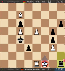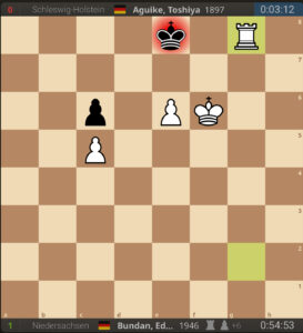 Es lief schon die fünfte Stunde dieser Partie. Zu diesem Zeitpunkt stand es schon 4:3 für die Auswahl aus Schleswig-Holstein. Ein Remis hätte auch eine Niederlage für die ganze Mannschaft bedeutet. Edward kämpfte weiter und wartete auf den Fehler vom Gegner. Und dann passierte es! Toshiya spielt Th1 und gibt Schach. Und genau auf diesen Zug hat Edward bei der Stellung gewartet. Engine zeigte sofort von 0,0 auf +5,9.